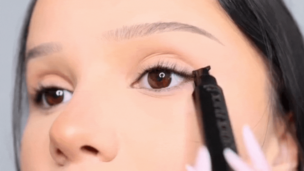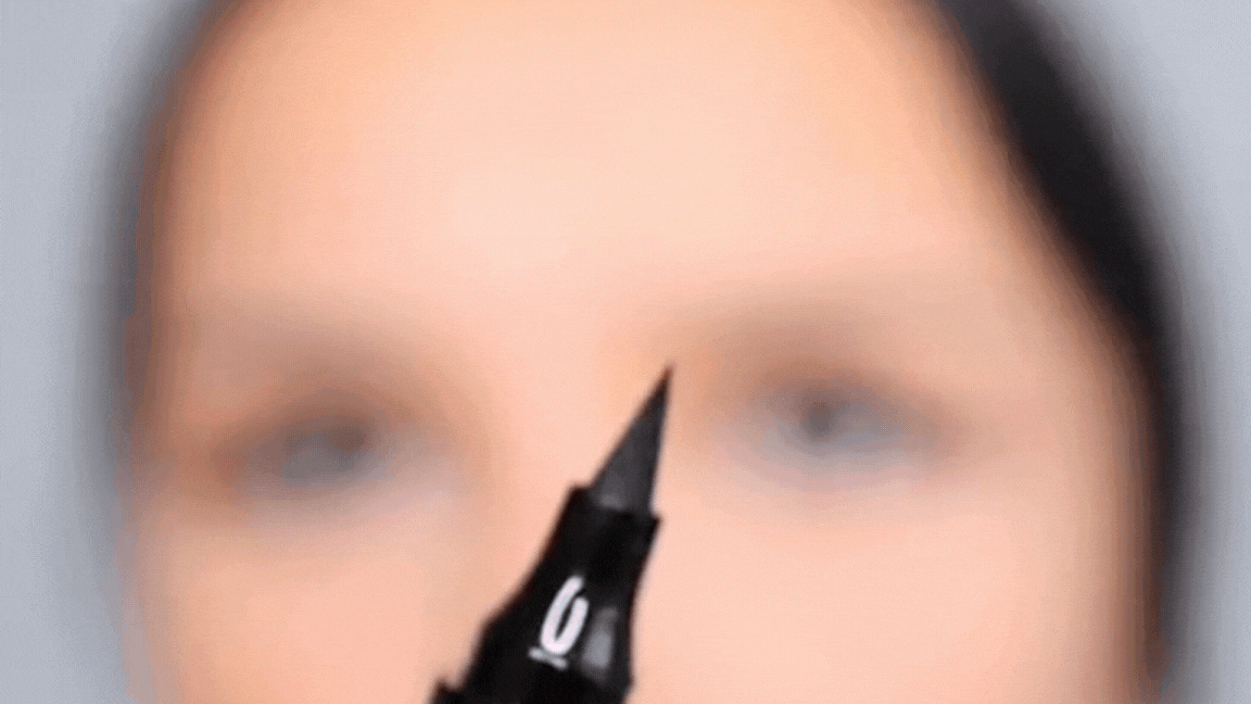 [IMAGEM/GIF DO PASSO 2] Passo 2: Delineie. Use a caneta hidrográfica ultrafina para conectar a asa à linha dos cílios.